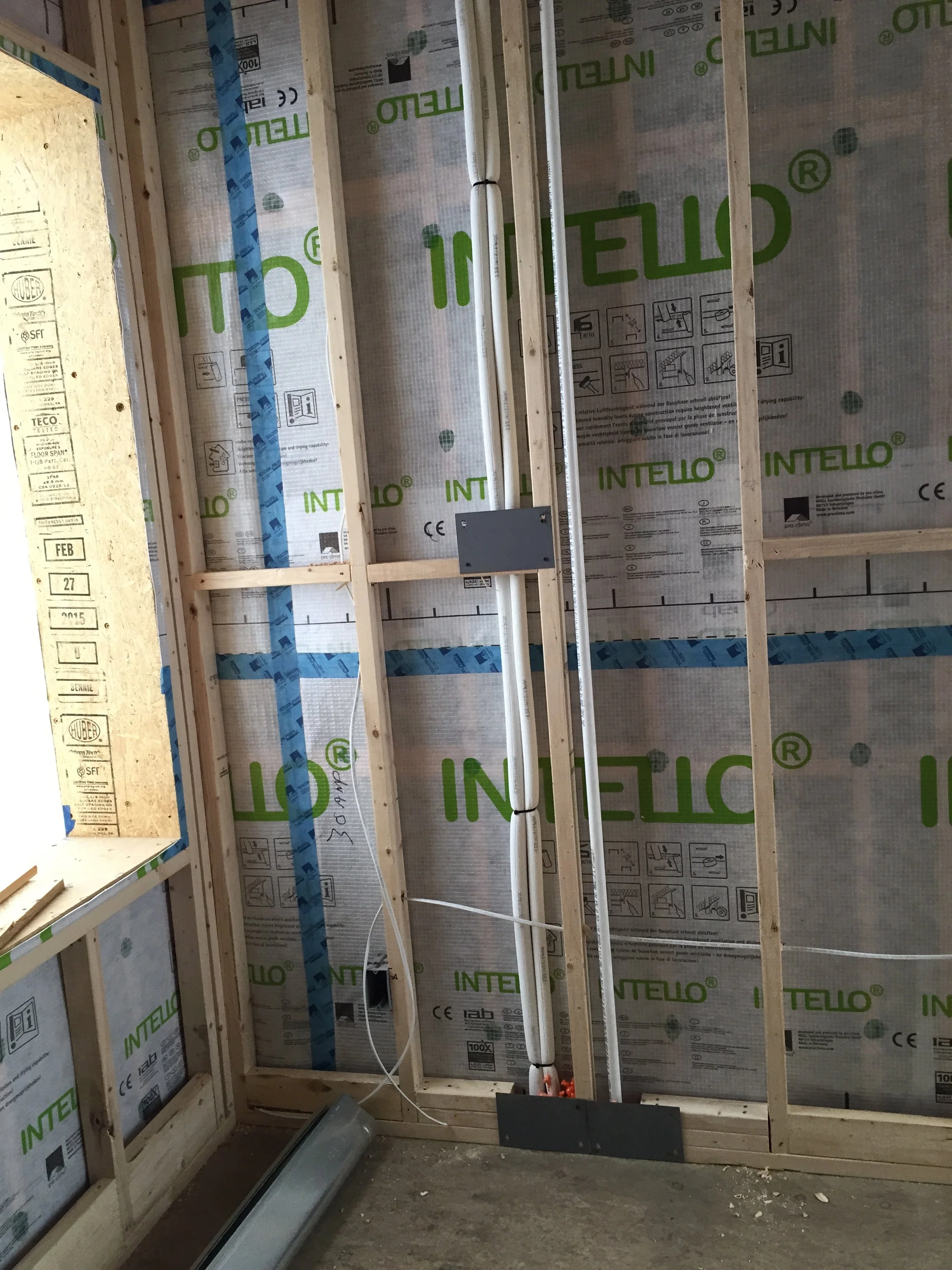 The Riverview Net Neutral House illustrates how passive design strategies are integral to the success of the project and long term building performance. A continuous “intelligent” air barrier was installed throughout the house to allow some moisture migration through the building assembly but prevent air infiltration and exfiltration. To help ensure the integrity of the air barrier, a “service cavity” was added to the interior face of the wall assembly. Electrical wiring and plumbing piping can now be run within the service cavity avoiding penetrations through the air barrier and helping preserve its integrity for the life of the building. Coupled with increased insulation levels and high performance doors and windows, this barrier significantly reduces energy loss through the building envelope. Less energy lost to the outdside means less energy is required to keep the interiors comfortable, even during periods of more extreme outdoor temperatures.